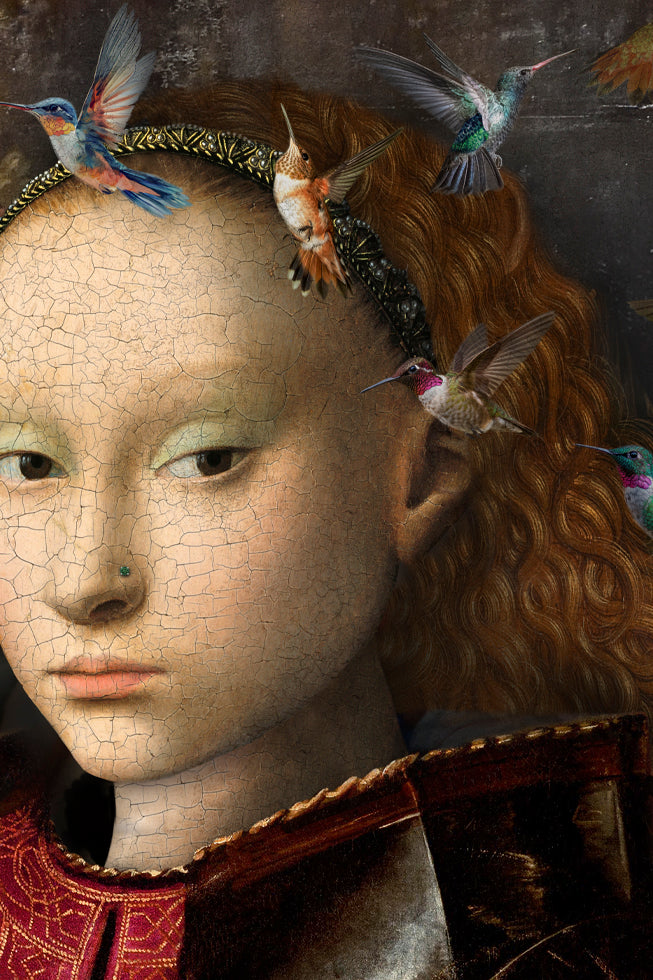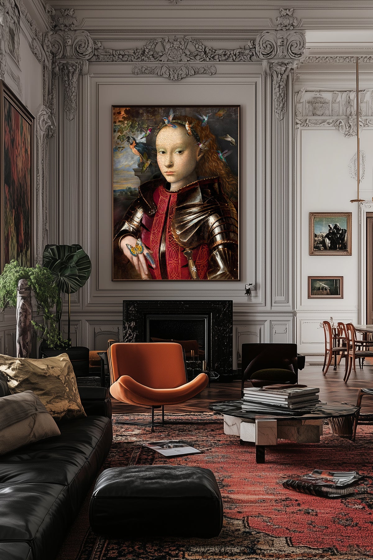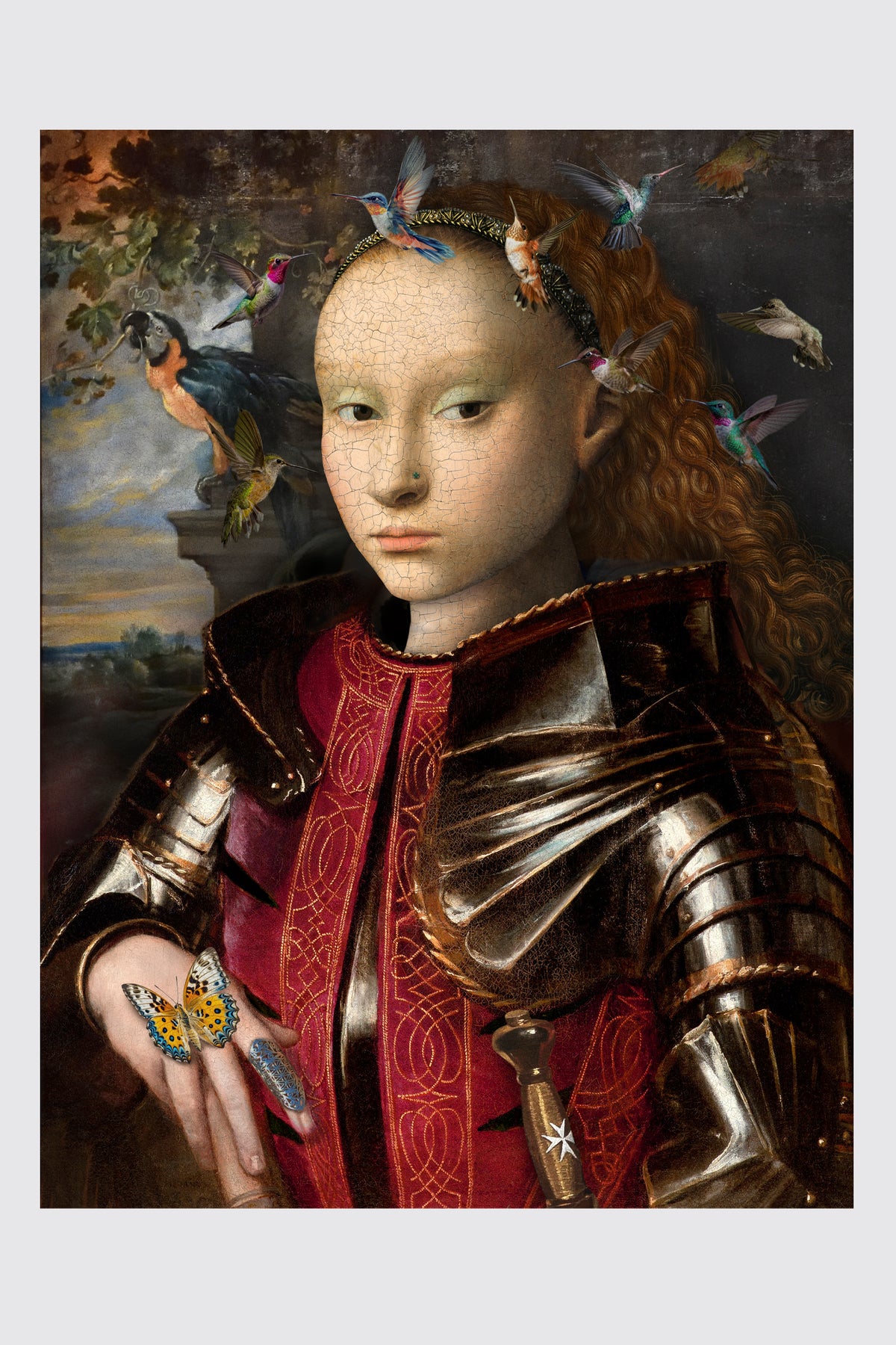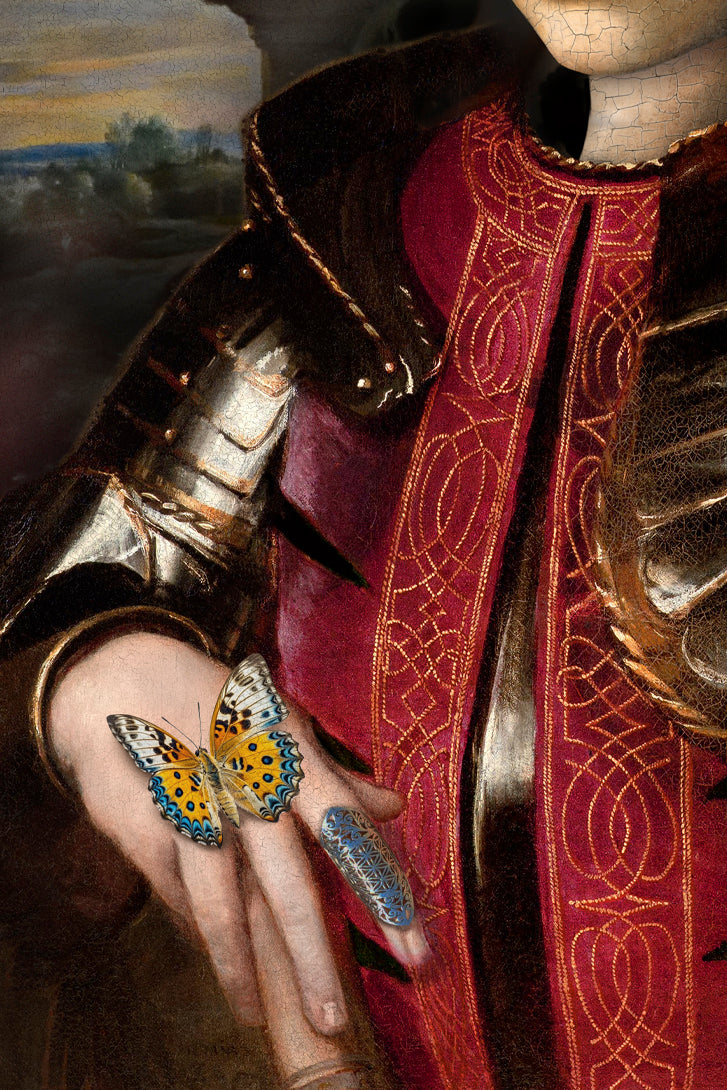 Behold “Iron Maiden”, the Renaissance warrior who took “dress to impress” way too literally. Clad in armor polished enough to blind her enemies and embroidered velvet that screams “battle, but make it fashion,” she commands the room with a look that says, “Yes, I joust, but I also brunch.” The hummingbirds orbit her like tiny paparazzi, while butterflies perch politely as if waiting for autographs. She’s not here to slay dragons—she’s here to slay… period. No AI or word prompts were used in the creation of this digital art piece.